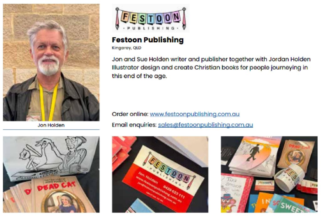 It has been some time since the last blog was posted – too long! This is not because nothing has been happening, it is actually the opposite – too much has been happening and it has been a challenge to keep up with events as they unfold. This not cause for complaint, but rather, there has been a sudden growing spurt for the Festoon Publishing business as opportunities have opened up for doing business with book selling businesses from around the world. How did this come about? I stumbled across an invitation whilst browsing the internet, to attend a Christian booksellers conference near Penrith NSW. I had some books that fitted that category so I decided to became a member of the organization, the Christian Booksellers Association of Australia (CBAA), and attended the conference. What I discovered was a wealth of information that came like a flood over the next two full days of the conference. It was here that I was to find out what a bookseller is looking for when they are looking at stocking their shelves with Christian books (and any other worthwhile book that they consider to be a winner, for that matter.) One of the